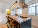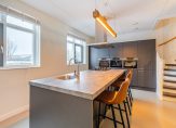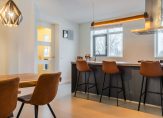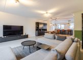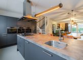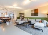 Vervolgens bereikt u de woonkamer die door de uitbouw en entree via de berging heerlijk ruim en licht is. Aan de voorzijde is de luxe keuken gelegen met kookeiland en is voorzien van inbouwapparatuur (vaatwasser, 5-pits gaskookplaat, afzuigkap, koelkast, combi oven en koffiezetapparaat).