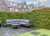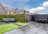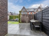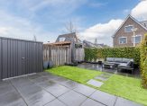 De ruime en sfeervolle achtertuin, die ook achterom te bereiken is, is op het zuiden gesitueerd waardoor er gedurende de gehele dag volop van de zon genoten kan worden. De achtertuin is voorzien van een elektrische zonnescherm en buitenkraan. Een parkeerplaats op eigen terrein completeert het geheel. Aan de voorzijde is een groenstrook waar kinderen heerlijk kunnen spelen.