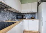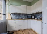 Verrassend ruime woonkamer met bergkast met aansluiting wasapparatuur en aan voorzijde zitgedeelte met toegang tot de half open keuken. De in L-vorm opgestelde keuken is voorzien van inductie kookplaat, afzuigkap en vaatwasser. Tevens is in de keuken een deur naar het zonnig (zuidwest) balkon aan de voorzijde.