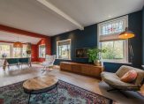 De lichte en sfeervolle woonkamer heeft aan 3 zijden raampartijen, diverse glas-in-lood ramen en openslaande deuren naar de achtergelegen tuin. De woonkamer is voorzien van een betonnen vloer met comfortabele vloerverwarming met een pvc-vloer.