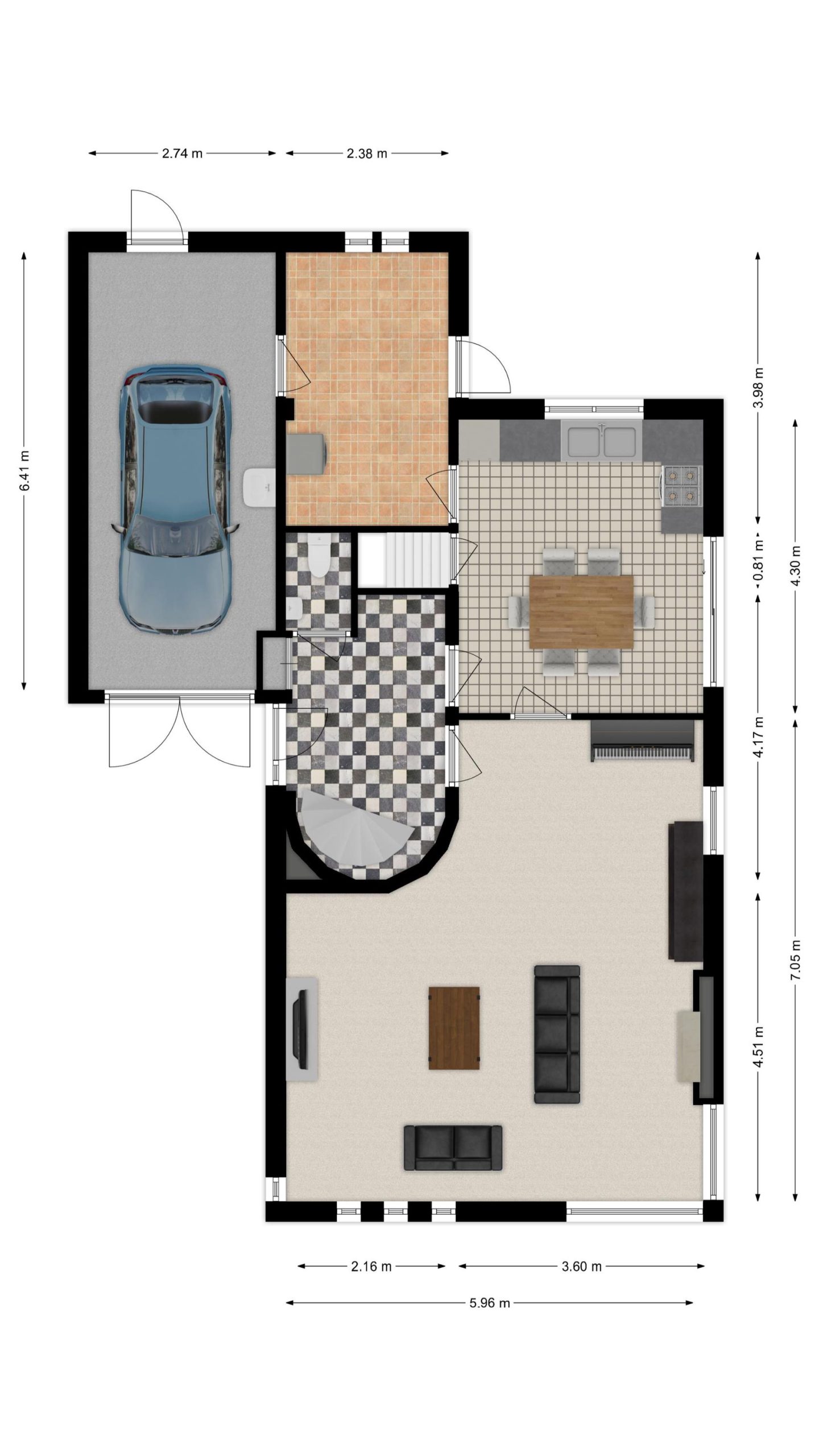 – Garage : ca. 6.41 x 2.74 m.