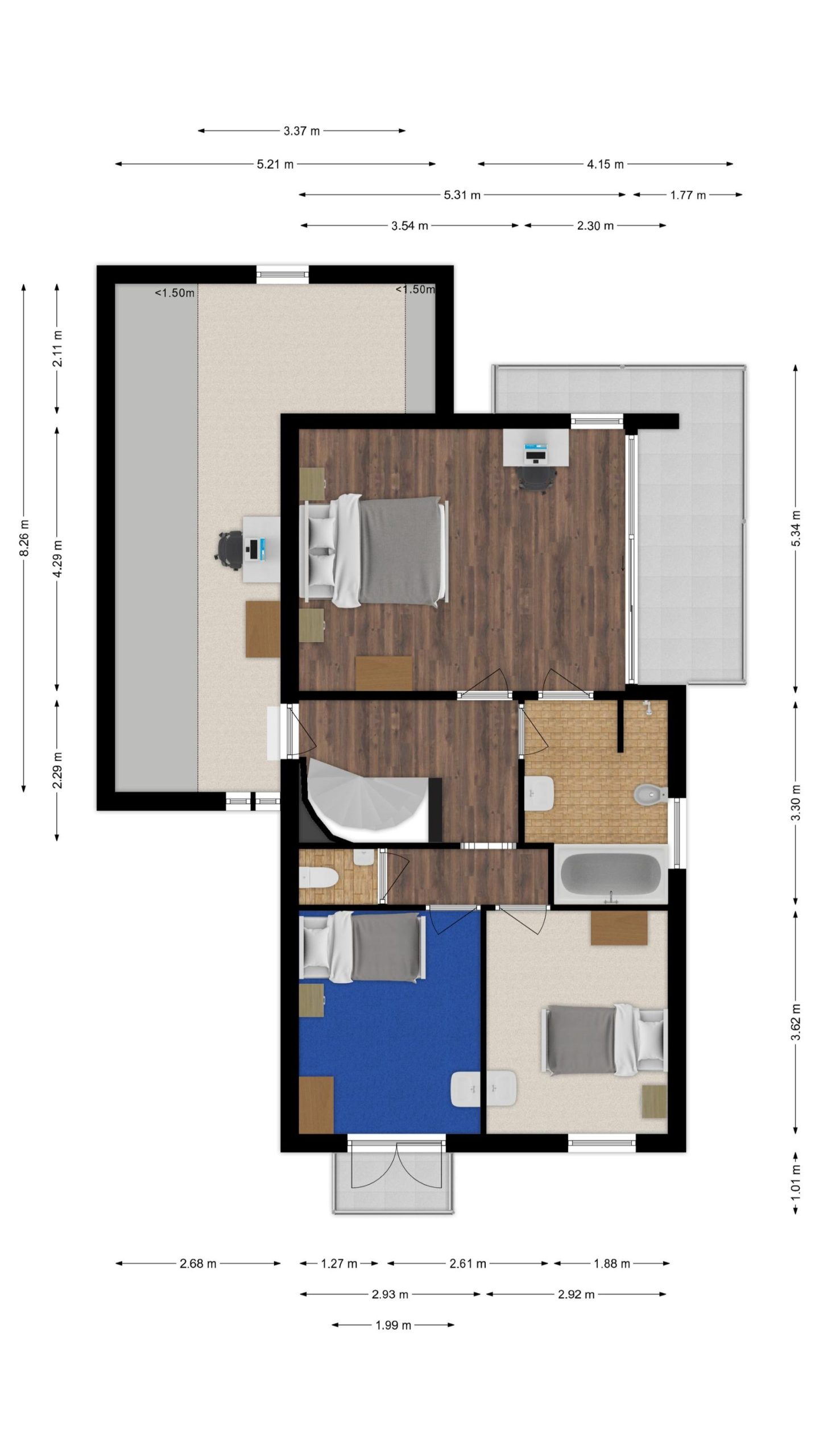 – Kamer boven garage : ca. 8.26 x 3.37/1.50 (hoogte 1.50m) m.