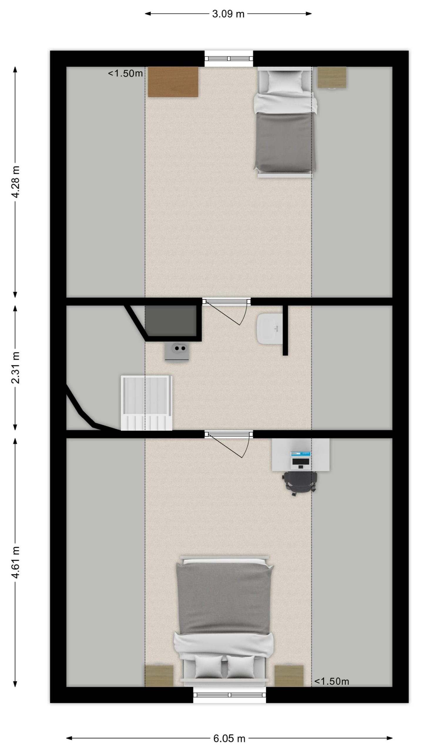 – Slaapkamer (4) : ca. 4.28 x 3.09 (hoogte 1.50m) m.