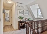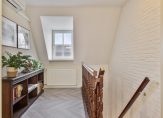 Op de 1e verdieping is een ruime overloop met dakkapel en airco. Er is toegang tot 3 slaapkamers en een ruime badkamer. De slaapkamers en overloop hebben een mooie ‘novilon’-vloerafwerking en er zijn volop bergkasten aanwezig op de grootste en kleinste slaapkamer. De badkamer beschikt eveneens over een dakkapel en is compleet uitgevoerd met een ligbad, inloopdouche, dubbele wastafel, douchetoilet en beschutte hoek met de witgoedaansluitingen. Er is een flinke bergzolder bereikbaar met een vlizotrap vanuit de overloop. Op zolder hangt de Nefit combiketel, is een waterontharder geplaatst en staat de centrale stofzuiginstallatie.