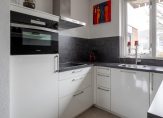 De U-vormige, in lichte kleurstelling opgetrokken moderne inbouwkeuken, is aan de voorzijde van het huis gesitueerd en voorzien van diverse inbouwapparatuur waaronder een 4-pits inductiekookplaat, afzuigkap, vaatwasser, koelkast en combimagnetronoven. Het aanrechtblad is van kunststof. In het aanrechtblad verwerkt een enkele RVS spoelbak. Vanuit de keuken heeft u een riant uitzicht over de voortuin, de voorgelegen straat en het aangrenzende hofje met parkeerplaatsen.