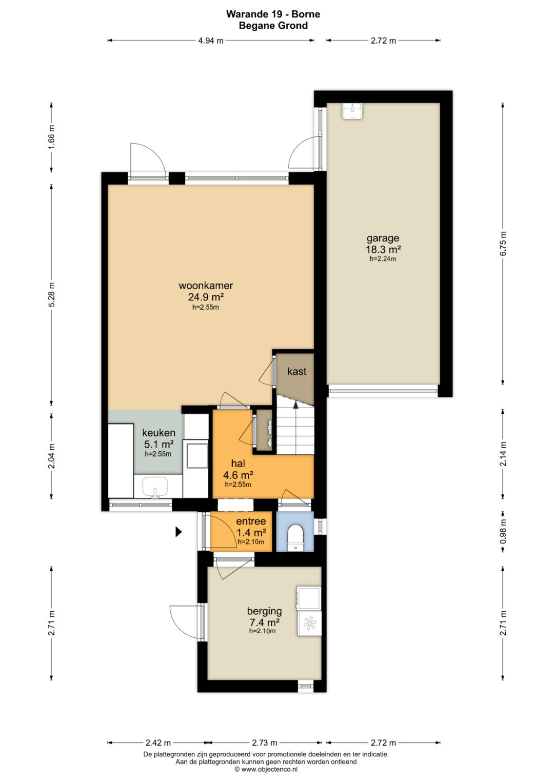 Zij ingang van waaruit toegang tot de entree/hal met toilet en meterkast, inpandige berging, trapopgang naar de eerste verdieping, keuken met inbouwkeuken, woonkamer met provisiekast, achtertuin en de garage.