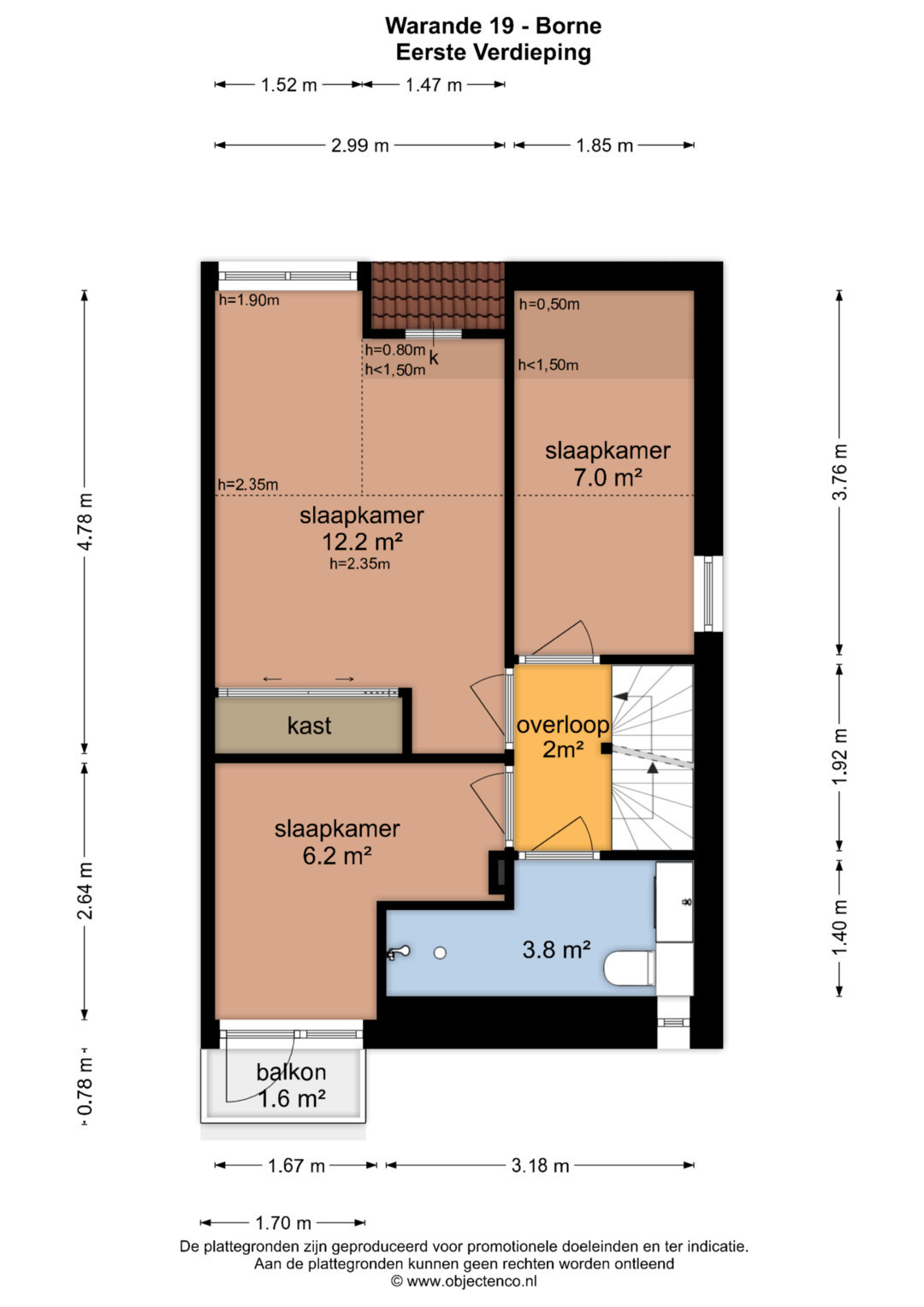 Overloop met drie slaapkamers, de badkamer en een vaste trap naar de tweede verdieping. De slaapkamers meten oppervlaktes van respectievelijk 13, 7 en 6 m². De ouderslaapkamer aan de achterzijde is voorzien van vaste kastruimte.