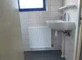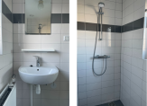 De badkamer is gelegen aan de voorzijde van de woning. Een neutrale wand- en vloertegel is hier geplaatst en de badkamer bevat een wastafel en douche.