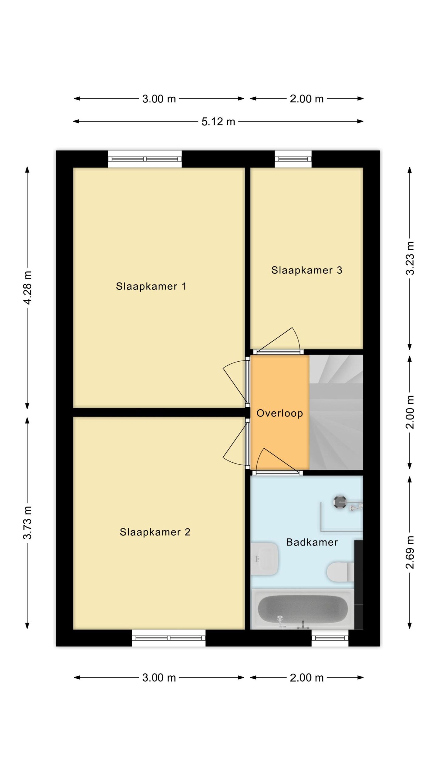 Via een vaste trap is de eerste verdieping bereikbaar met overloop, 3 slaapkamers en een badkamer.
