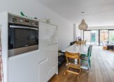 De uitgebouwde woonkamer met vaste trapkast is aan de achterzijde van de woning gelegen en geeft middels een brede schuifpui toegang tot de zonnige achtertuin. De open keuken bevindt zich aan de voorzijde en is voorzien van diverse inbouwapparatuur, zoals een 5-pitsgasfornuis met RVS afzuigkap, oven, koelkast, vriezer en vaatwasmachine.