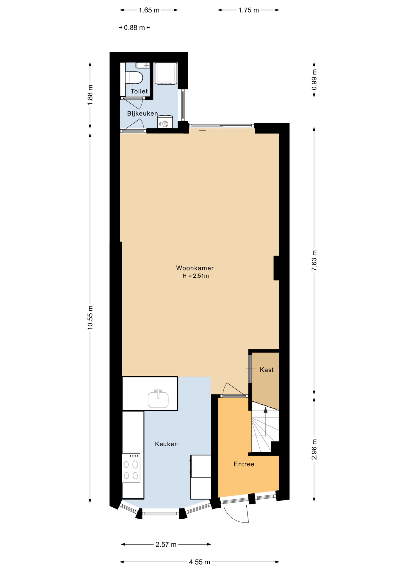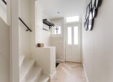 Entree, hal, garderoberuimte, meterkast, vaste trap naar de eerste verdieping en toegang tot de woonkamer met open keuken.