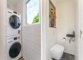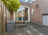 De uitgebouwde woonkamer, met vaste kast onder de trap, is aan de achterzijde van de woning gelegen en geeft middels een schuifpui toegang tot de zonnige achtertuin. Vanuit de woonkamer is de bijkeuken bereikbaar met wasmachine- en drogeropstelling, CV-combiketel en toiletruimte met hangend toilet en fonteintje.