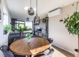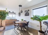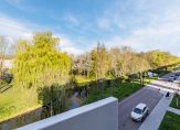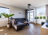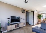 De royale, lichte woonkamer met open keuken biedt toegang tot het zonnige balkon gelegen op het westen met mooi uitzicht op het park. Aan de achterzijde van het appartement bevindt zich de open keuken, voorzien van diverse inbouwapparatuur zoals: koelkast, vriezer, vaatwasser, inductiekookplaat met geïntegreerde afzuiging en combi-oven/magnetron.