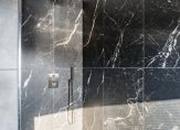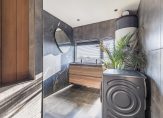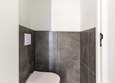 De moderne badkamer (voorheen keuken) is voorzien van een inloopdouche, 2-persoons wastafelmeubel en wasmachine-aansluiting. Tevens is hier de warmtepompboiler gesitueerd.