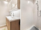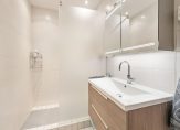 De nette badkamer is voorzien van een inloopdouche en wastafelmeubel.