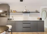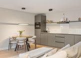 De woonkamer met open keuken en trapkast is gelegen aan de Kerkbrink-zijde met een leuk uitzicht over het plein. De complete open keuken is voorzien van inbouwapparatuur, te weten: koelkast met vriesvak, combi-oven/magnetron, vaatwasmachine en inductiekookplaat met afzuiging.