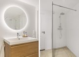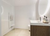 De badkamer is centraal in het appartement gelegen en voorzien van een inloopdouche, wastafelmeubel, hangend toilet en sierradiator.