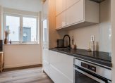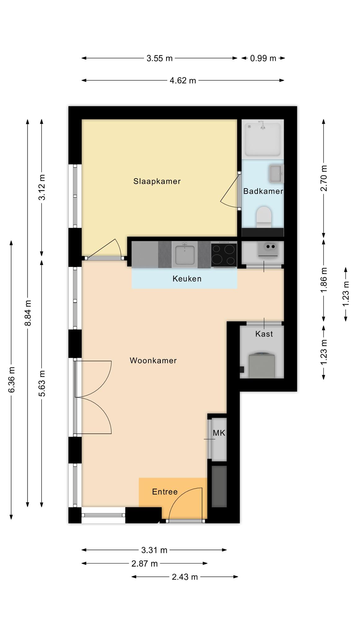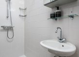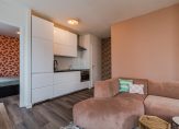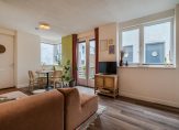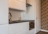 Entree, meterkast, gezellige woonkamer met openslaande deuren naar het tuintje en een open keuken voorzien van diverse inbouwapparatuur zoals een 4-pits elektrische kookplaat, rvs-afzuigkap, vaatwasmachine, combi-oven/magnetron en koelkast. Verder is er een vaste kast met wasmachine- en condens droger aansluiting aanwezig en een vaste kast met CV-opstelling en mechanische ventilatie. De slaapkamer bevindt zich achter in de studio en is via een deur afsluitbaar. Vanuit de slaapkamer is er toegang tot de badkamer. De badkamer is voorzien van een hangend toilet, wastafel, spiegelkastje en douche.