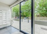 Centrale entree, hal met bellentableau, brievenbussen, intercom en toegang tot (afgesloten) tweede hal met lift, trapopgang en de bergingen in de onderbouw.