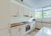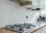 De dichte keuken ligt aan de voorzijde van het appartement en biedt een vaatwasmachine, koelkast, vriezer, 4-pits gasfornuis, afzuiging en combi-oven/magnetron.