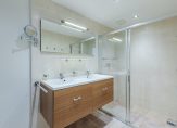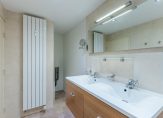 De keurig betegelde badkamer is voorzien van een royale inloopdouche, tweepersoons wastafelmeubel, sierradiator en wasmachine- en drogeraansluiting.