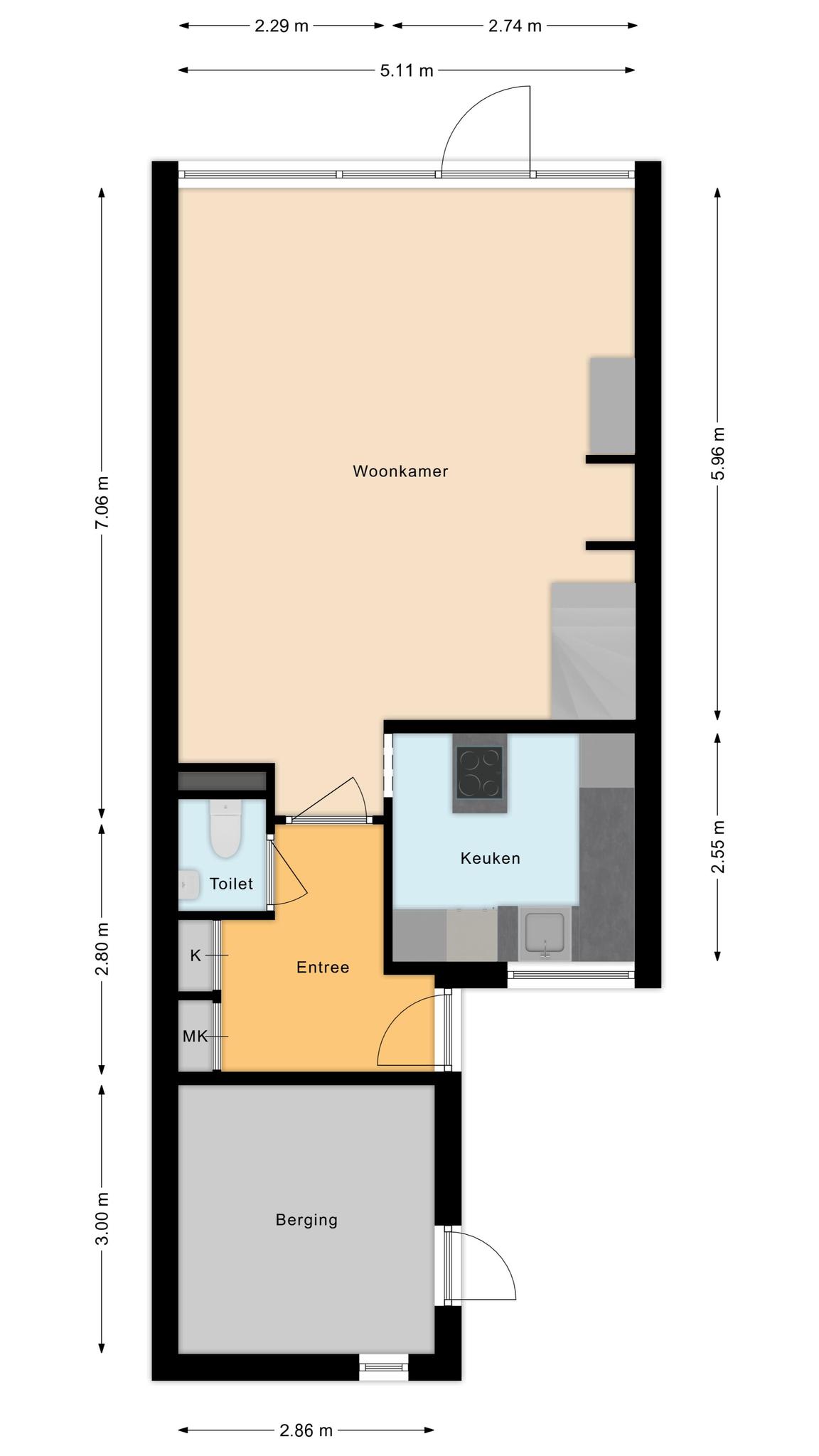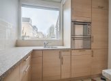 De halfopen keuken is aan de voorzijde van de woning gelegen en voorzien van diverse inbouwapparatuur, zoals een inductiekookplaat met afzuigkap, oven, warmhoudlade, koelkast, vriezer, vaatwasmachine en boiler. De trap naar de 1e verdieping bevindt zich in de woonkamer.