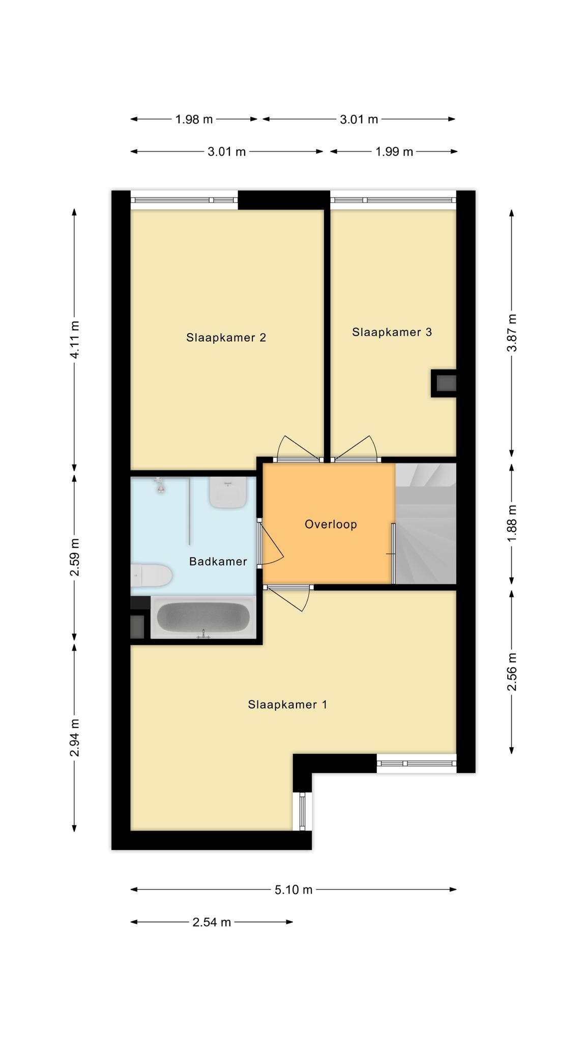 Via een vaste trap is de 1e verdieping bereikbaar met overloop, 3 slaapkamers en een badkamer.