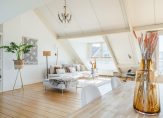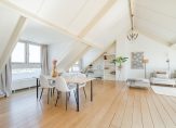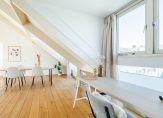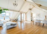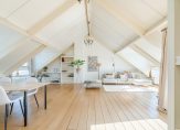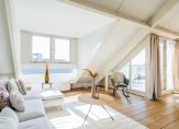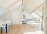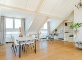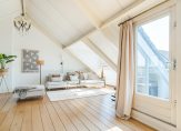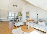 De royale woonkamer met hoge nok en dakkapellen is heel licht en heeft een mooi, weids uitzicht. De woonkamer leent zich er goed voor om een tweede slaapkamer te creëren (zie animatiefoto in de fotoreportage).
