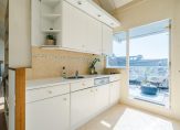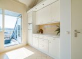 De halfopen keuken is voorzien van diverse apparatuur, zoals een vaatwasmachine, elektrische kookplaat met afzuiging en koelkast met vriezer. Vanuit de keuken heb je toegang tot het zonnige balkon.