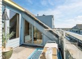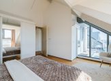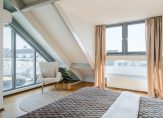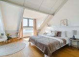 Zeer ruime slaapkamer met airco, hoge nok, dakkapel en zicht op het balkon.