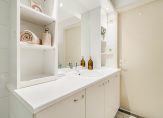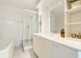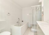 De badkamer is voorzien van een ligbad met douche, douchecabine, wastafelmeubel en toilet.