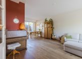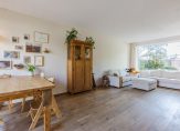 De woonkamer met houten vloer is aan de voorzijde gesitueerd. Hier bevindt zich een vaste kast met veel bergruimte (onder de trap, netjes weggewerkt). Aan de achterzijde is het eetgedeelte gesitueerd met een brede glazen pui (heerlijk licht) en deur naar de achtertuin. De open keuken (2019) is eveneens aan de achterzijde gelegen en biedt diverse inbouwapparatuur, zoals een oven (2025), elektrische kookplaat, afzuiging, vaatwasmachine en losse koelkast met vriezer. Vanuit de keuken is de achtertuin ook toegankelijk.