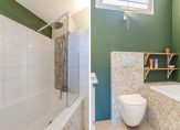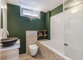 De badkamer is voorzien van een ligbad met douche, wastafelmeubel en 2e hangend toilet.