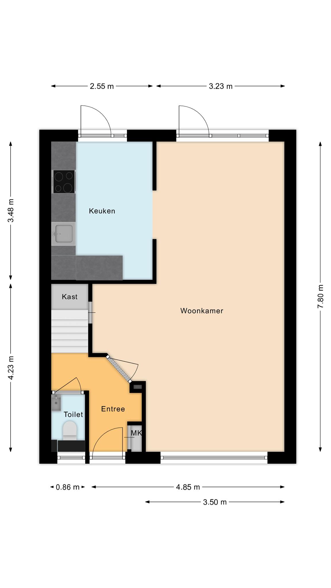 Entree, hal met garderoberuimte, meterkast, toiletruimte met hangend toilet en fonteintje en toegang tot de woonkamer met open keuken.