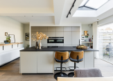 De lichte woonkamer met open haard is aan de voorzijde gelegen. Aan de achterzijde is de woning uitgebouwd en voorzien van een lichtstraat waardoor er veel natuurlijk licht binnen komt. De woonkeuken (2023) met eiland is voorzien van een Miele inductiekookplaat met geïntegreerde afzuiging, Quooker, vaatwasmachine, grote koelkast en grote vriezer, combi-oven/magnetron (Siemens) en oven (Siemens). Middels openslaande deuren is de achtertuin bereikbaar.