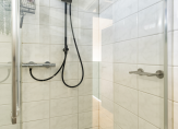 De badkamer biedt een douchecabine, 2e toilet, 2-persoons wastafelmeubel en sierradiator.