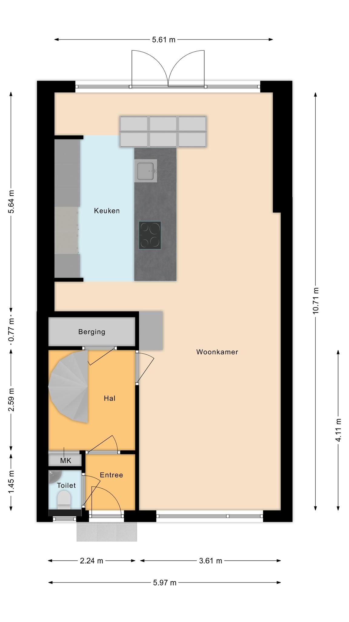 Entree, hal, garderoberuimte, hangend toilet met fonteintje, meterkast, spiltrap naar de eerste verdieping, ruime vaste kast en toegang tot de woonkamer en open keuken.