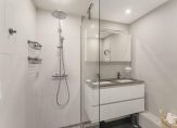 De nette badkamer is voorzien van een inloopdouche, dubbel wastafelmeubel en hangend toilet