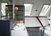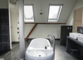 De badkamer, met doorkijk tot in de nok, verbindt de overloop met de master bedroom. Hier kunt u genieten vanuit het ligbad kijkend naar de wolken of de sterren. De badkamer is o.a. voorzien van een ruime inloopdouche met massagestraal, toilet, dubbele wastafelmeubel en een verwarmde spiegel. De natuurstenen vloer is voorzien van elektrische vloerverwarming. Design ten top en laat u hier verrassen door licht en ruimte.