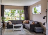 Links in de hal is een deur naar de woonkamer, die in open verbinding met de keuken staat. Het zitgedeelte is aan de voorzijde, met lichtinval aan twee zijden, en het eetgedeelte grenst aan de keuken. Er hangt een airco-unit die, samen met de vloerverwarming, voor een aangename temperatuur zorgt.