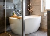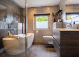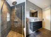 De luxe badkamer heeft een fraaie uitstraling, met grote tegels op de wanden en vloer. Blikvanger is het vrijstaande bad en verder zijn er een inloopdouche, toilet en een wastafelmeubel in deze mooie ruimte. Erg fijn is de lichtinval, via het grote raam in de voorgevel.