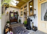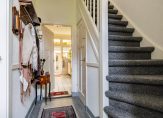 Aan de voorzijde, naast de haag, is de entree van deze charmante woning. In de hal zie je, aan de rechterzijde, de trap naar de eerste verdieping. Ook de trap naar de wijn-/provisiekelder bevindt zich, net als de toiletruimte, in de hal. Maar het allermooiste is de originele granitovloer, een van de typische elementen uit de jaren 30.