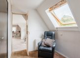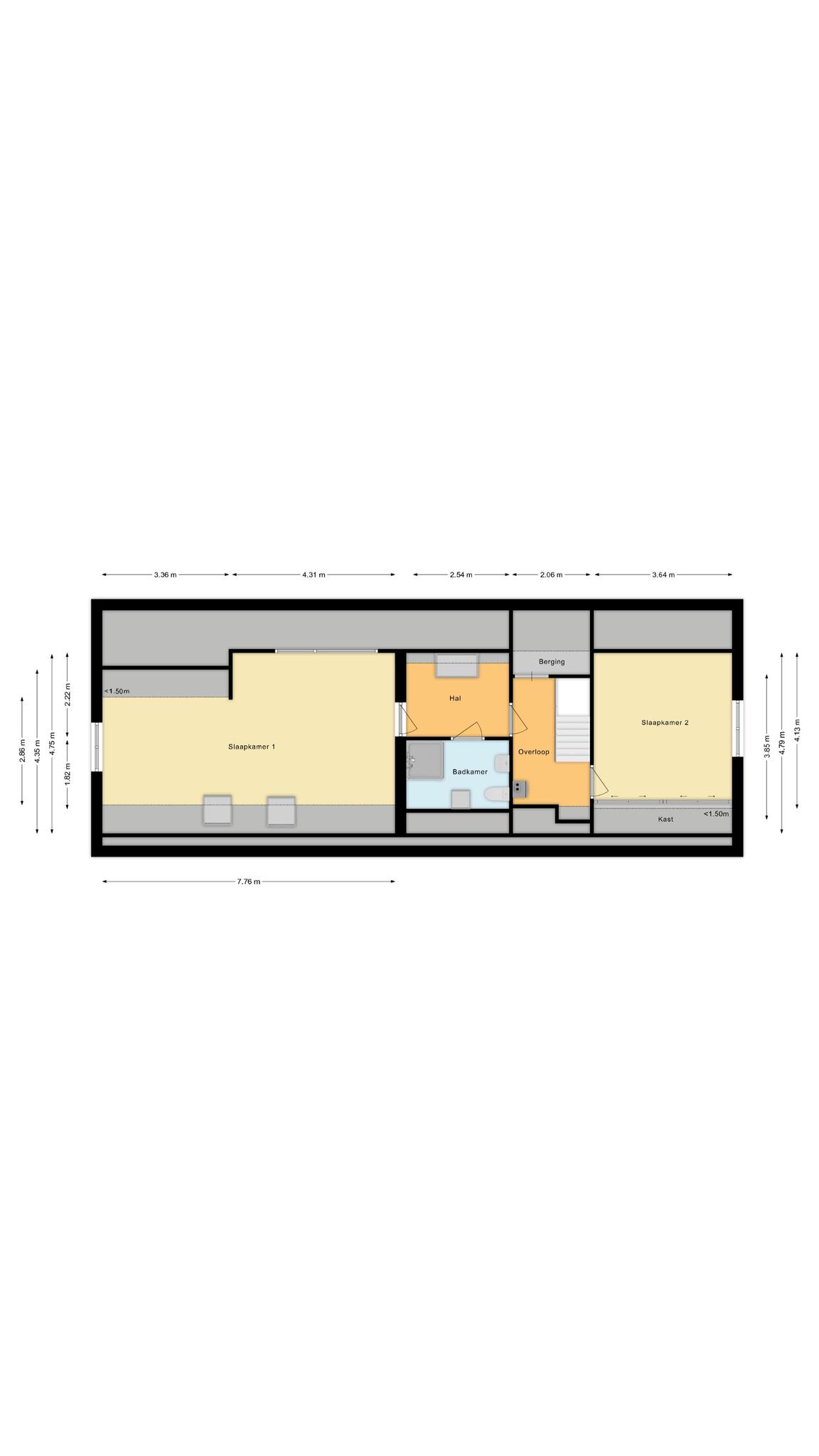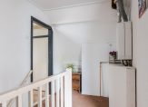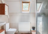De verdieping beschikt over een royale overloop met dakkapel, twee slaapkamers (met de mogelijkheid voor een derde) en een badkamer met toilet, douche en wastafel.
