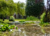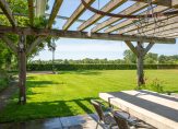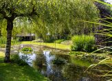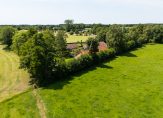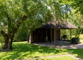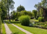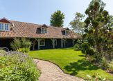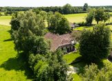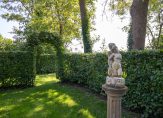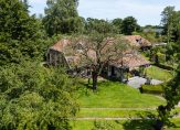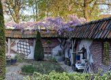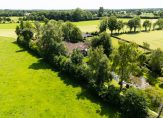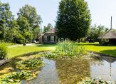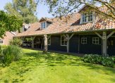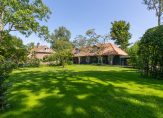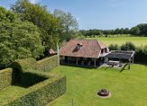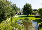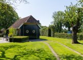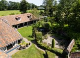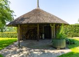 De woonboerderij wordt omringd door een parkachtige tuin, met prachtige oude bomen en een groot gazon. Hoge bossages aan de rand van de tuin zorgen voor optimale privacy en beschutting ten opzichte van de wind. Grote vijvers stralen een aangename rust uit en verspreid over het perceel staan meerdere bijgebouwen, variĂŤrend van een grote schuur/garage met smeerput tot een ronde houtopslag met rieten dak.