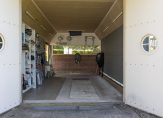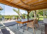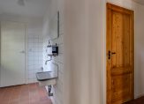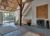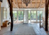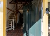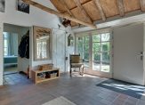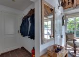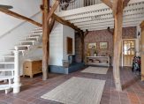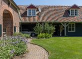 Aan het einde van de oprijlaan rij je de oprit op, richting de carport. Aan deze zijde is de entree van deze prachtige woonboerderij, die toegang biedt tot een indrukwekkende hal met een hoge vide. De dakconstructie is zichtbaar, en aan de linkerzijde is de trap naar de eerste verdieping.