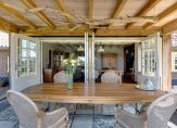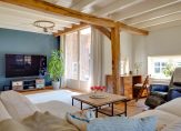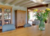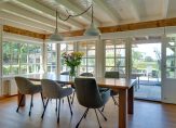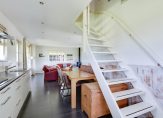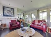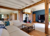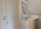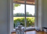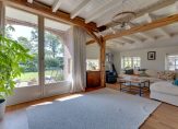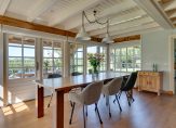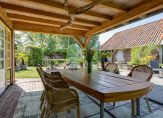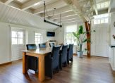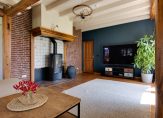 We gaan eerst naar de woon-/eetkamer, met openslaande deuren naar de achtertuin en het overdekte terras aan de zonnige zuidwestkant. Terwijl je rondloopt, geniet je van de aangename rust die hier volop aanwezig is. Wat opvalt zijn de verschillende plafondhoogtes, de grote schouw met houtkachel en de fraaie afwerking.