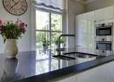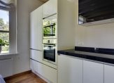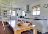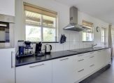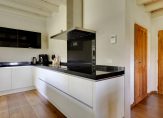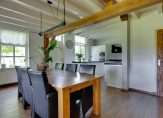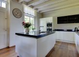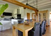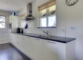 Vanuit de hal en woonkamer is de woonkeuken, die minstens net zo sfeervol is. Ook hier is ruimte voor een grote eettafel en is er aan twee kanten toegang tot de tuin. De moderne keukenopstelling met eiland is in 2007 geplaatst, qua kleur ingetogen en van hoge kwaliteit. De inductie kookplaat, afzuigkap, oven, combimagnetron, vaatwasser, koelkast en vriezer zijn ingebouwd. Naast de keuken is een inpandige berging, die als provisieruimte gebruikt kan worden.