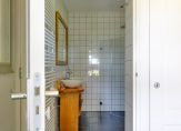 Aan de voorzijde van de woonboerderij is een slaapkamer, met een ruime kledingkast. Een gang, met een toiletruimte, verbindt deze kamer met de ontvangsthal. Ook is er een stijlvolle en luxe badkamer (2022) op de begane grond, aan de achterzijde van de woonboerderij. Deze ruimte is ingedeeld met een inloopdouche met Sunshower, een toilet, een open kast met vijf planken en een houten meubel waarop twee wastafels staan. Naast de badkamer is een wasruimte, te bereiken vanuit een L-vormige gang.