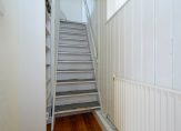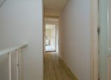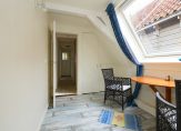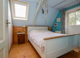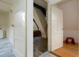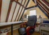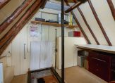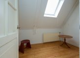 De eerste verdieping is bereikbaar via een separate hal aan de zijkant van de woning, waar ook het toilet zich bevindt. Boven tref je vier slaapkamers, elk voorzien van een dakraam voor natuurlijk licht. De badkamer biedt een wastafel en een ligbad met douche, waar een klapraam zorgt voor frisse lucht. Op de overloop geeft een vlizotrap toegang tot een tweede zolderverdieping, waar zich de Cv-ketel en extra bergruimte bevinden.