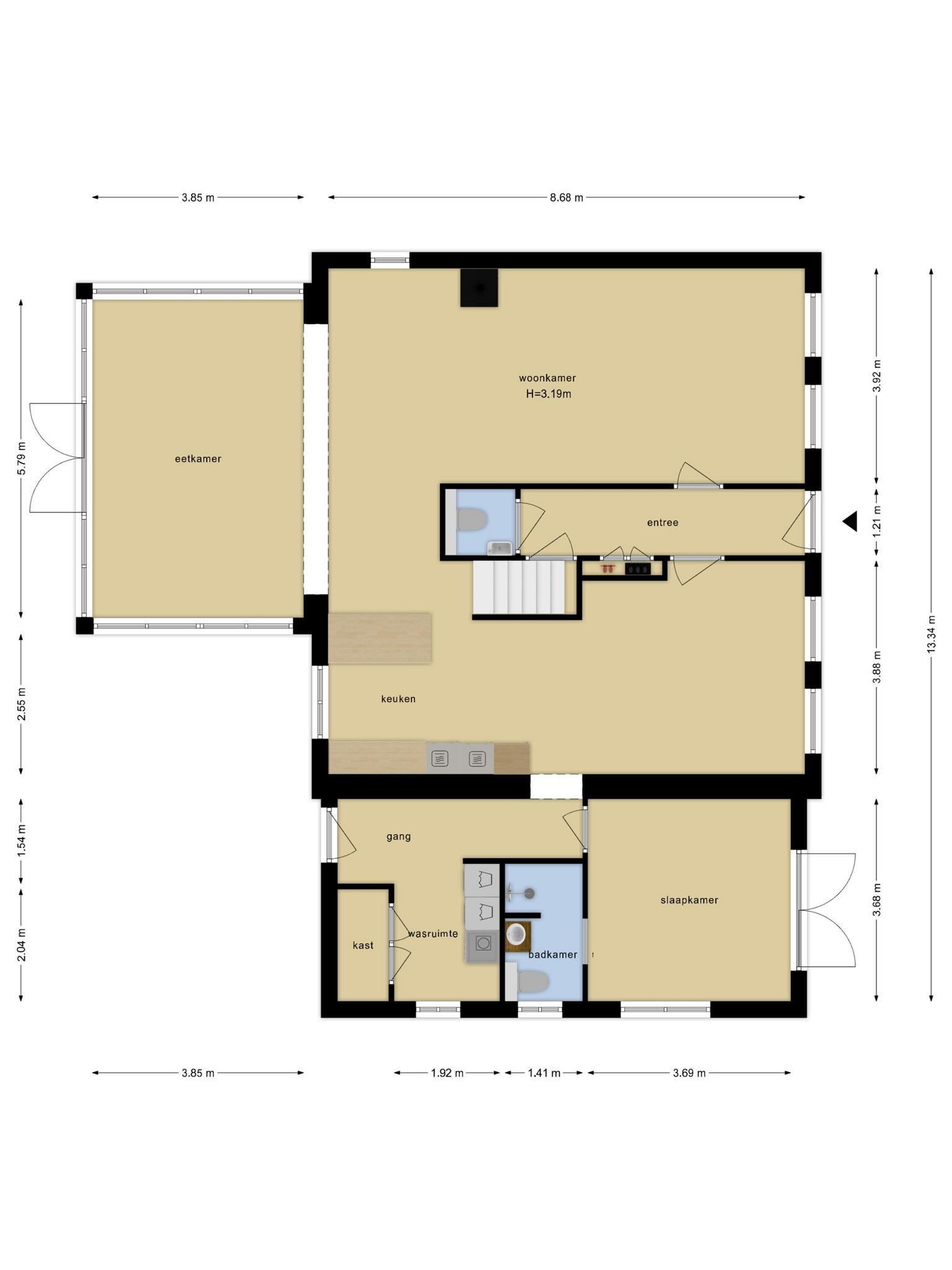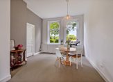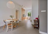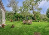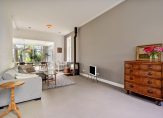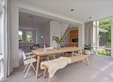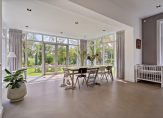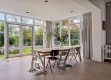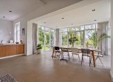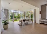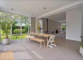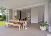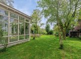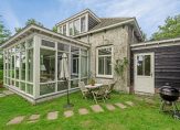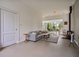 De entree, voorzien van glanzend Italiaans marmer uit Carrara, zet direct de toon: ingetogen grandeur. Vanuit de hal leidt een stijlvolle trap omhoog, terwijl u wordt uitgenodigd tot de woonkamer waar het licht vrij spel heeft. De houtkachel van Dik Geurts brengt warmte, sfeer en verhalen. In 2019 is aan de achterzijde een serre toegevoegd, met royale raampartijen en openslaande deuren naar de tuin – een transparante overgang van binnen naar buiten.